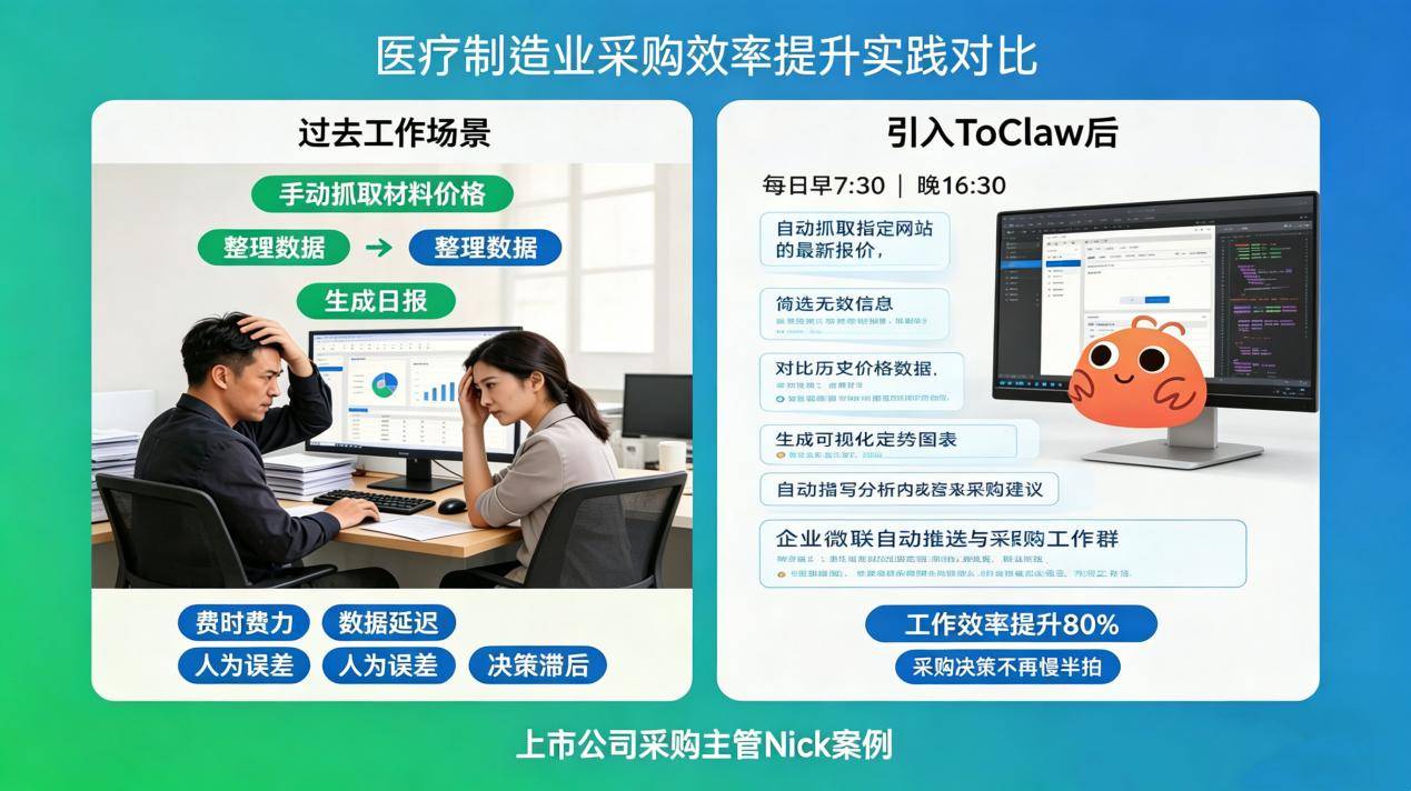 ToClaw的介入改变了这一切。每日早7:30和晚16:30,ToClaw自动抓取指定网站的最新报价,筛选无效信息,对比历史价格数据,生成可视化走势图表,并按模板自动撰写分析内容与采购建议,最终通过企业微信自动推送至采购工作群。Nick每天仅需5分钟验收成果。