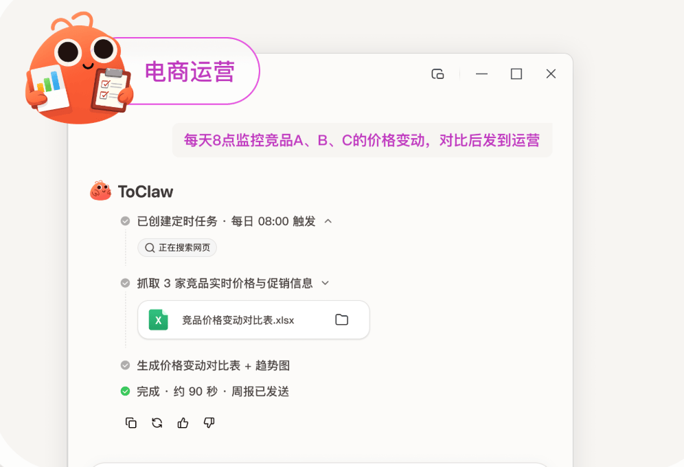 ToClaw不只是“告诉你该怎么做”,而是“直接帮你做完”。它像一位不知疲倦的数字员工,默默守在电脑那一端,准时执行、精准交付——把时间还给真正需要人的地方。