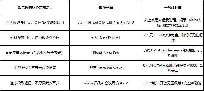 推荐人群:高频会议人士、跨境工作者、记者/律师/金融从业者。如果你追求“戴上耳机即拥有一个AI记录助理”的沉浸式体验,viaim 讯飞AI会议耳机是目前市场上最成熟的选择。