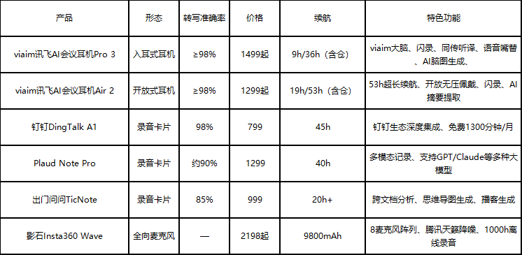 综合来看,在AI记录设备最主要的功能转写准确率中,viaim 讯飞AI会议耳机遥遥领先,在几款核心竞品中表现最为全面。