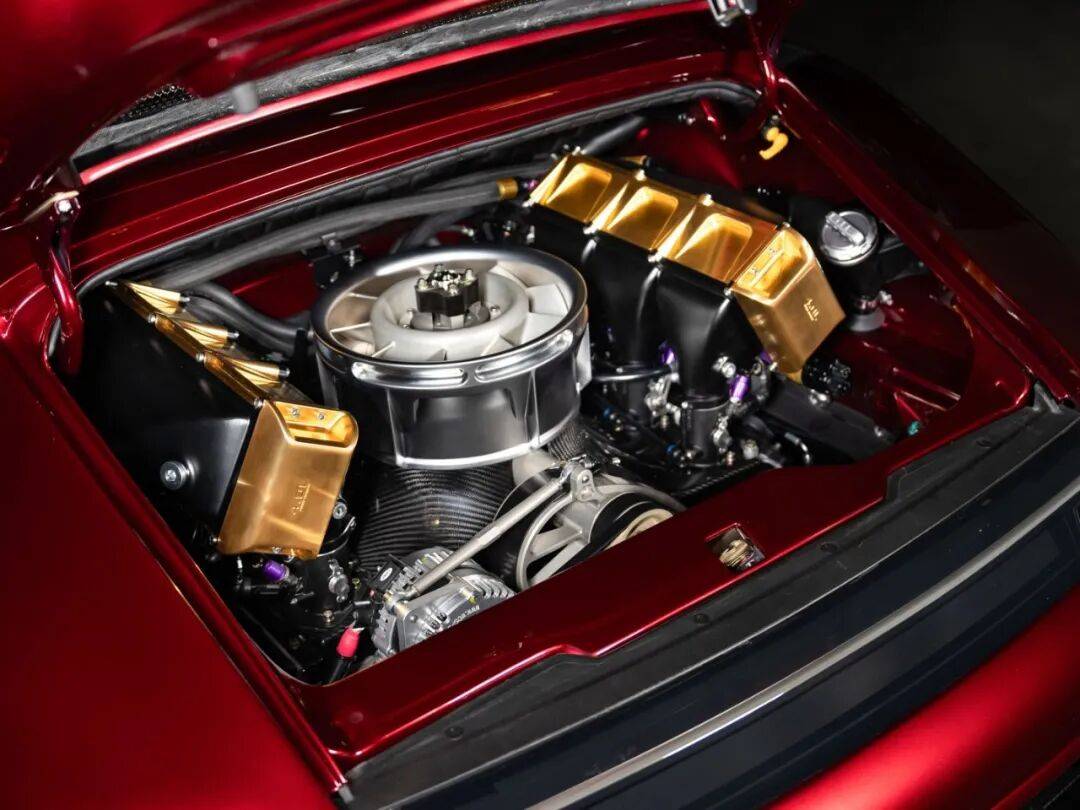 这款改装车采用极具视觉冲击力的红色金属漆面,车身点缀金色装饰条,整体造型让人联想到钢铁侠的战甲。设计师通过全碳纤维车身覆盖件和空气动力学套件,在保持经典993轮廓的同时,将整车重量大幅降低。车头部分经过重新设计,前保险杠融入更多导流槽,配合宽体轮拱,营造出蓄势待发的战斗姿态。