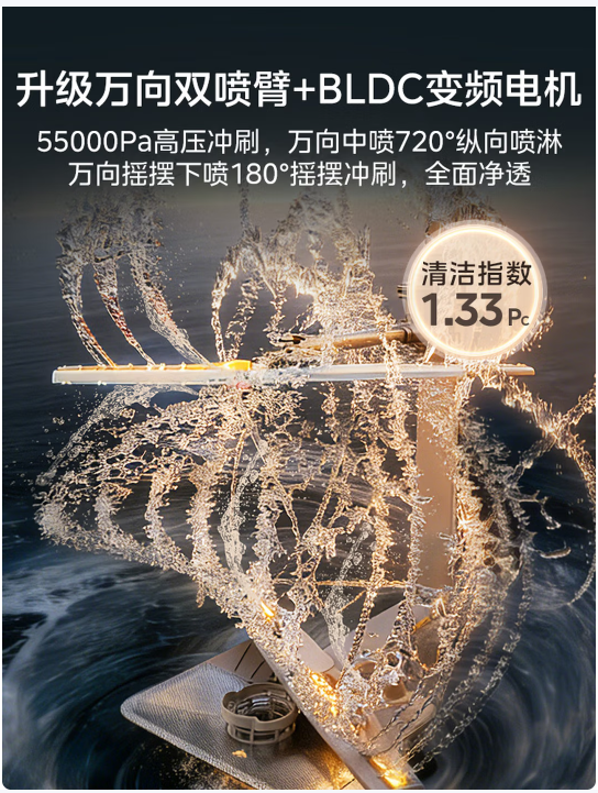 万向喷淋彻底解决了这个问题。其原理是主喷臂带动副喷臂旋转,既能横向360°旋转,又能纵向360°翻转,实现多点多面多向冲刷。升级版的万向喷淋2.0(由万向中喷+万向下喷组成),配合BLDC变频电机,可达到55000Pa高压水压,实现720°全腔无死角冲刷。