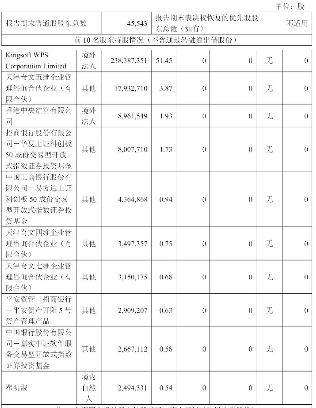 股权结构显示,控股股东金山软件持有51.45%股份,通过全资子公司北京金山奇文企业管理咨询有限责任公司实际控制天津奇文四维、五维、七维等合伙企业,这些企业合计持有5.3%股份。雷军作为金山软件名誉董事长,通过持有金山软件15.22%股权间接控制金山办公51.47%表决权。前十大股东还包括香港中央结算有限公司、华夏上证科创板50ETF等机构投资者。