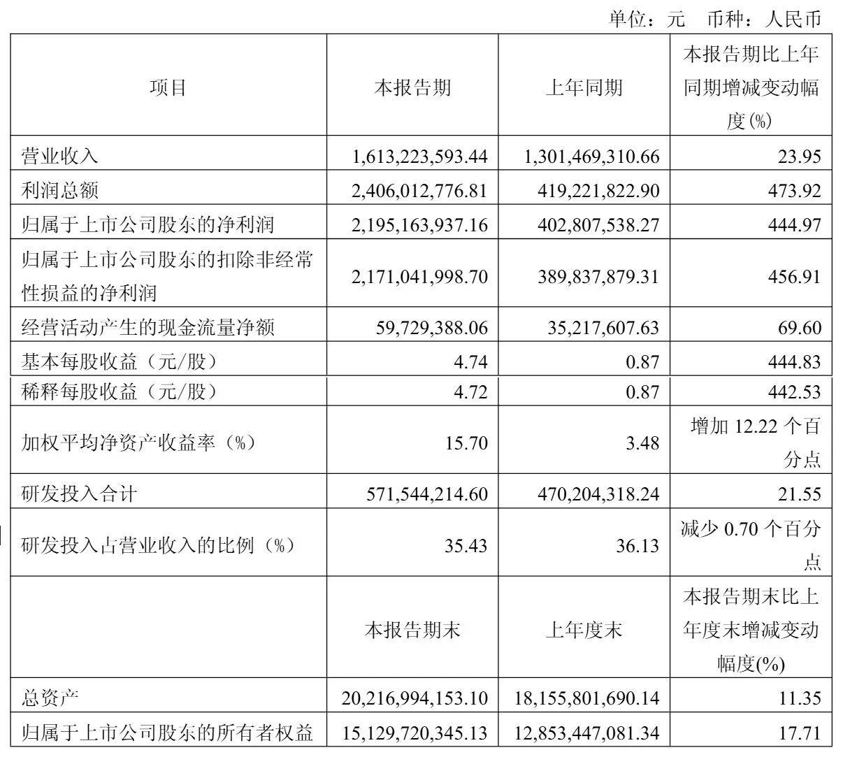 财报显示,公司当季净利润呈现爆发式增长,达到21.95亿元,同比增长445%;扣除非经常性损益后净利润为21.71亿元,增幅达357%。这一显著增长主要得益于对外投资基金产生的投资收益。研发方面持续保持高投入,当季研发投入5.72亿元,同比增长21.55%,占营业收入比重达35.46%。