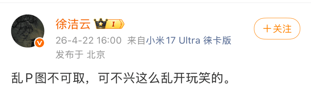 小米集团董事长特别助理徐洁云紧急辟谣,在微博晒出原始图片与AI生成图的对比,直言"乱P图不可取"。他特别强调,这类虚假信息不仅误导公众,更可能对品牌形象造成实质性伤害。数据显示,相关话题在愚人节当天获得超3亿次阅读,其中约四成网友最初表示相信这些"官宣"。