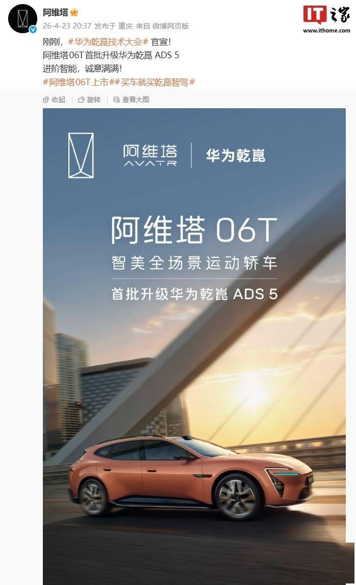 阿维塔品牌近日宣布,旗下全场景运动轿车阿维塔06T将迎来重大技术升级——首批车型将搭载华为乾崑ADS 5智能驾驶系统。这一消息为已上市的阿维塔06T再添科技亮点,进一步强化了其在智能电动汽车领域的竞争力。