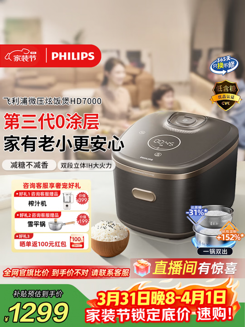 飞利浦HD7000是专为4-5人家庭打造的4L健康电饭煲,主打316L 0涂层内胆、IH微压加热与专利低糖技术,适合控糖人群。医用级316L不锈钢内胆,0涂层设计彻底告别脱落隐患。物理防粘结构让米饭不粘底,清水一冲即净,清洁无负担。加热上搭载IH电磁加热+微压技术,1250W立体大火力均匀渗透米芯,微压焖煮让米粒更Q弹、香气更浓,还能缩短烹饪时间。优势是核心专利控糖技术,通过蒸汽循环降低还原糖、提升抗性淀粉,轻松煮出低糖饭,契合健康饮食需求。4L黄金容量,搭配304不锈钢蒸屉,金属质感机身,香槟金配色高级大气,全触控面板操作直观,整机易拆洗,无卫生死角,家用还是送礼都体面实用。