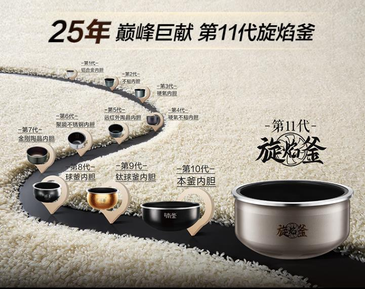 作为苏泊尔旋焰釜系列的顶配款,一步到位的首选。一样是第十一代4mm厚旋焰釜内胆,一级不粘工艺,PFA健康涂层,母婴认证,可直接放洗碗机。同时,旋焰沸煮技术、上盖远红外穿透加热、蒸汽补炊技术三大黑科技,支持五常米、东北米、泰香米、细苗米4种米种多档口感可调,且采用高清彩色触控屏操作直观,8K高抛金色不锈钢圈,鎏光金属机身质感和时尚感拉满。14种烹饪模式,涵盖煲仔饭、卤肉、发面、宝宝辅食等,全场景覆盖高端家庭需求,并支持24小时智能预约和智能语音播报,兼顾颜值与实用性。