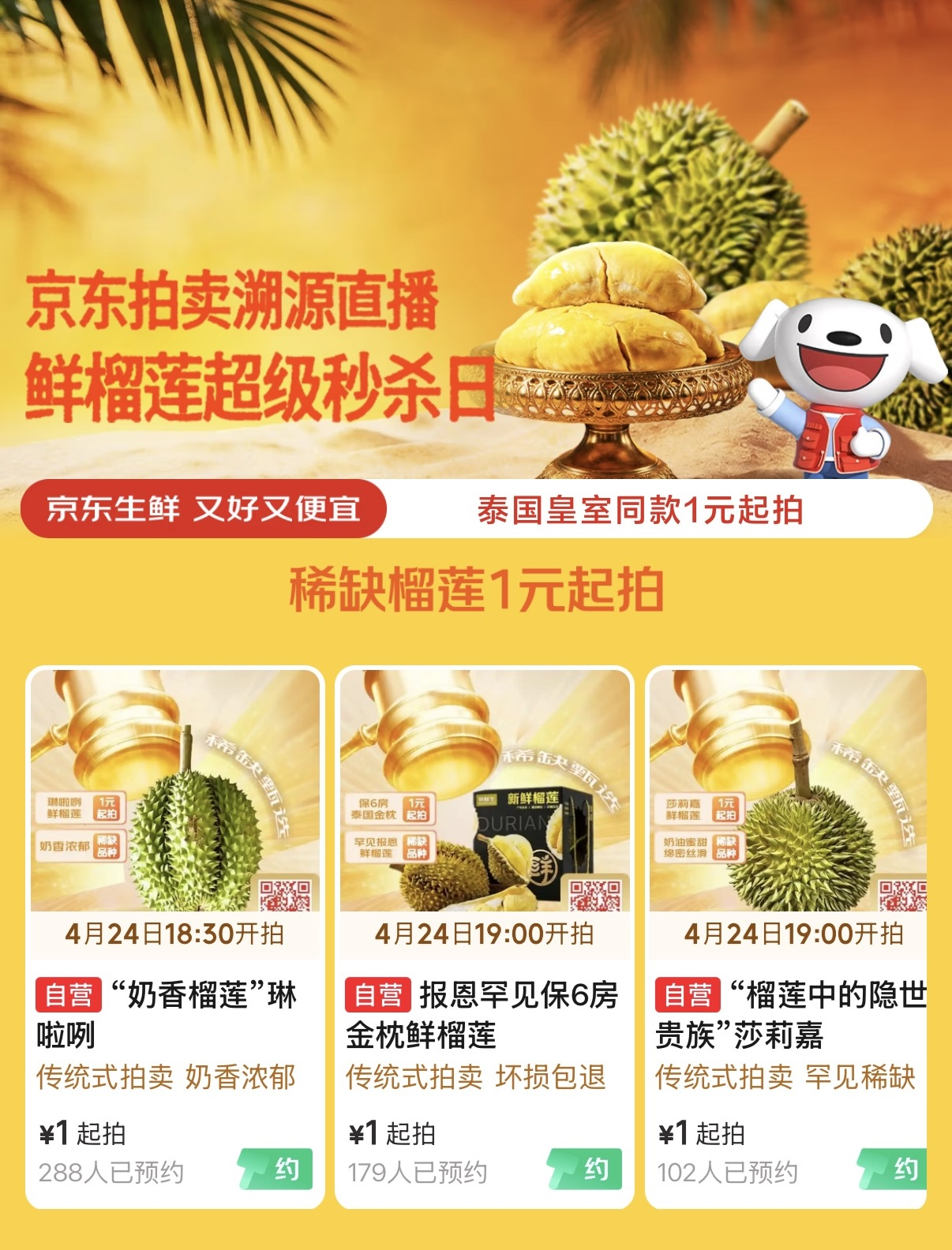 4月24日的15点至20点,京东生鲜将在泰国产地开启榴莲拍卖溯源直播,并联合京东拍卖带来榴莲1元起拍活动,除了前面提到的糯米鸡、长柄之外,还有祖母之星、黑刺、琳啦咧等“万分之一”甚至“千万分之一”的稀缺品种,都是1元起拍。此外当天还有鲜榴莲超级秒杀日惊喜,金枕榴莲14斤仅299.9元,低至21.5元/斤,更有9.9元抢榴莲、1元秒榴莲等限时福利,为国内消费者带来全新的榴莲消费体验。
