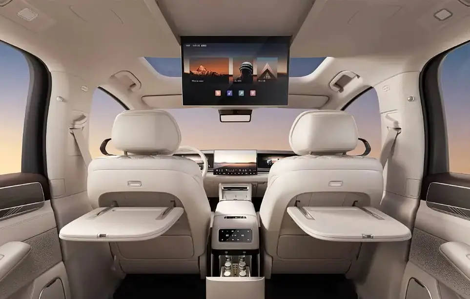 座椅配置堪称亮点,2+2+3布局中第二排采用独立双座设计,配备零压座椅、一体式腿托及菱形缝线工艺,支持一键放倒功能。折叠显示屏、车载小桌板与冰箱的加入,将第二排打造成移动商务舱。第三排座椅不仅支持电动调节,还配备加热功能,全车舒适性配置覆盖所有座位。智能驾驶层面,天神之眼B高阶智驾系统可实现城市与高速路段的辅助驾驶功能。