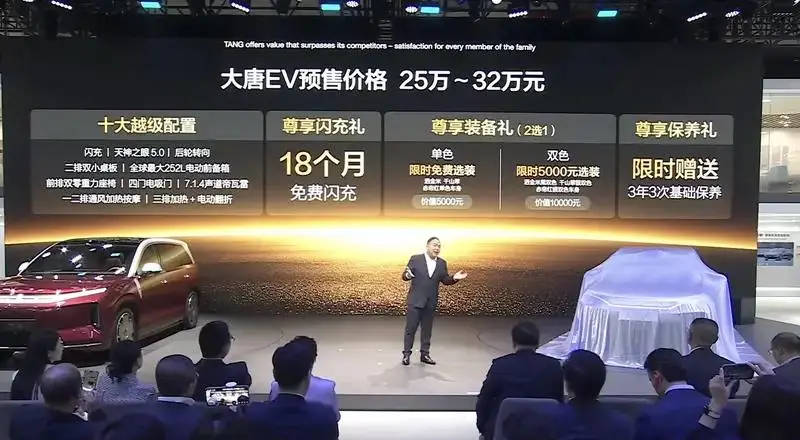 北京车展现场,比亚迪全新大型七座SUV“大唐”正式揭开神秘面纱,其中EV车型同步开启预售,价格区间锁定25万至32万元。这款新车以插混与纯电双动力布局切入市场,直接对标40万元以上高端SUV领域,凭借空间、配置与性能的全面升级,成为车展焦点之一。