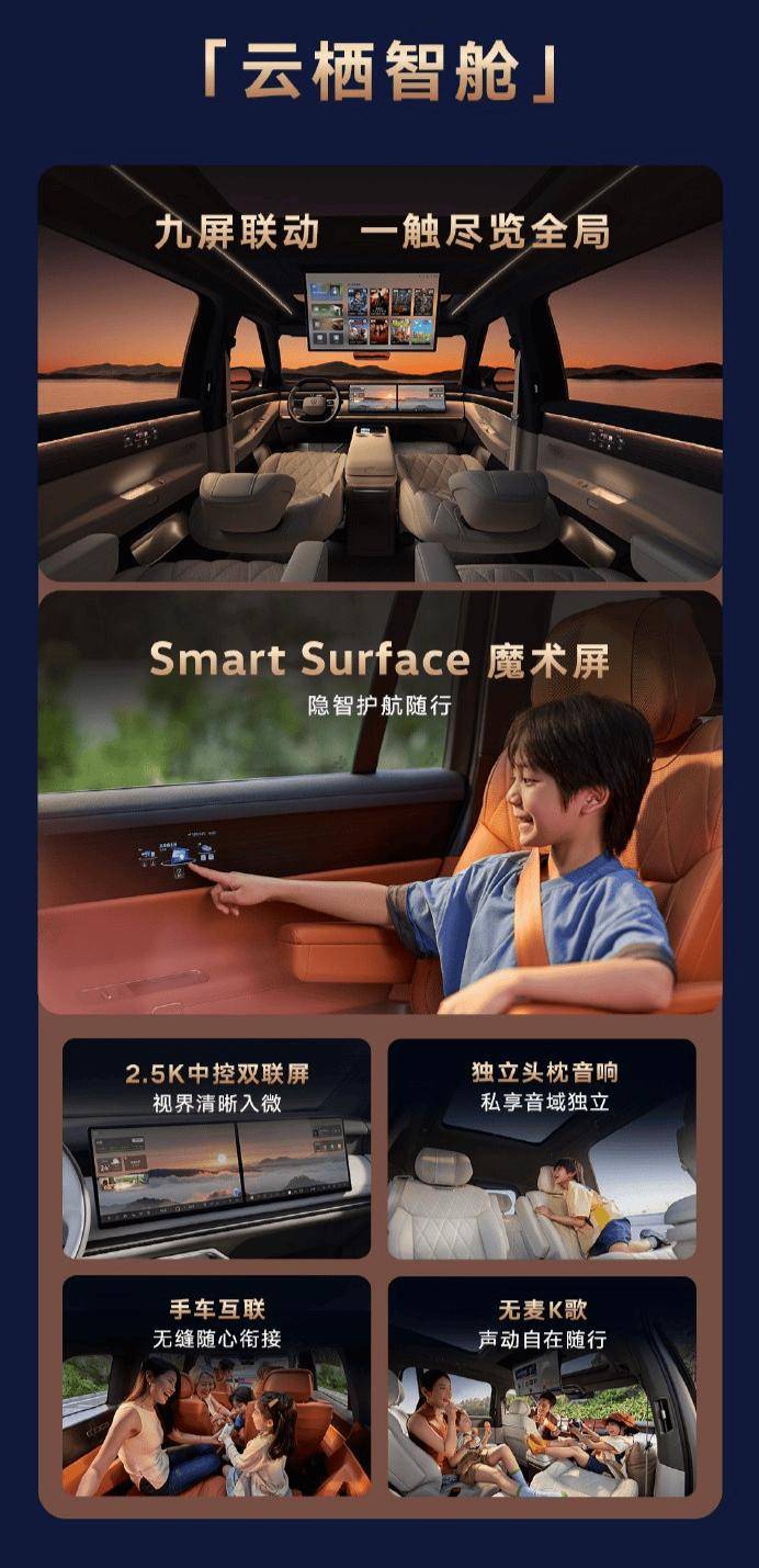 智能座舱成为核心亮点之一。车内配备15.6英寸超高清双联屏、21.4英寸后排可折叠吸顶屏,并搭载视角补偿膜技术优化视觉体验。座椅系统采用"女王座椅"与第二排行政级座椅的组合,首发动态零重力座椅配备12L大容量坐垫气囊,为乘客提供接近零重力的乘坐感受。六座布局兼顾家庭出行与商务场景需求。