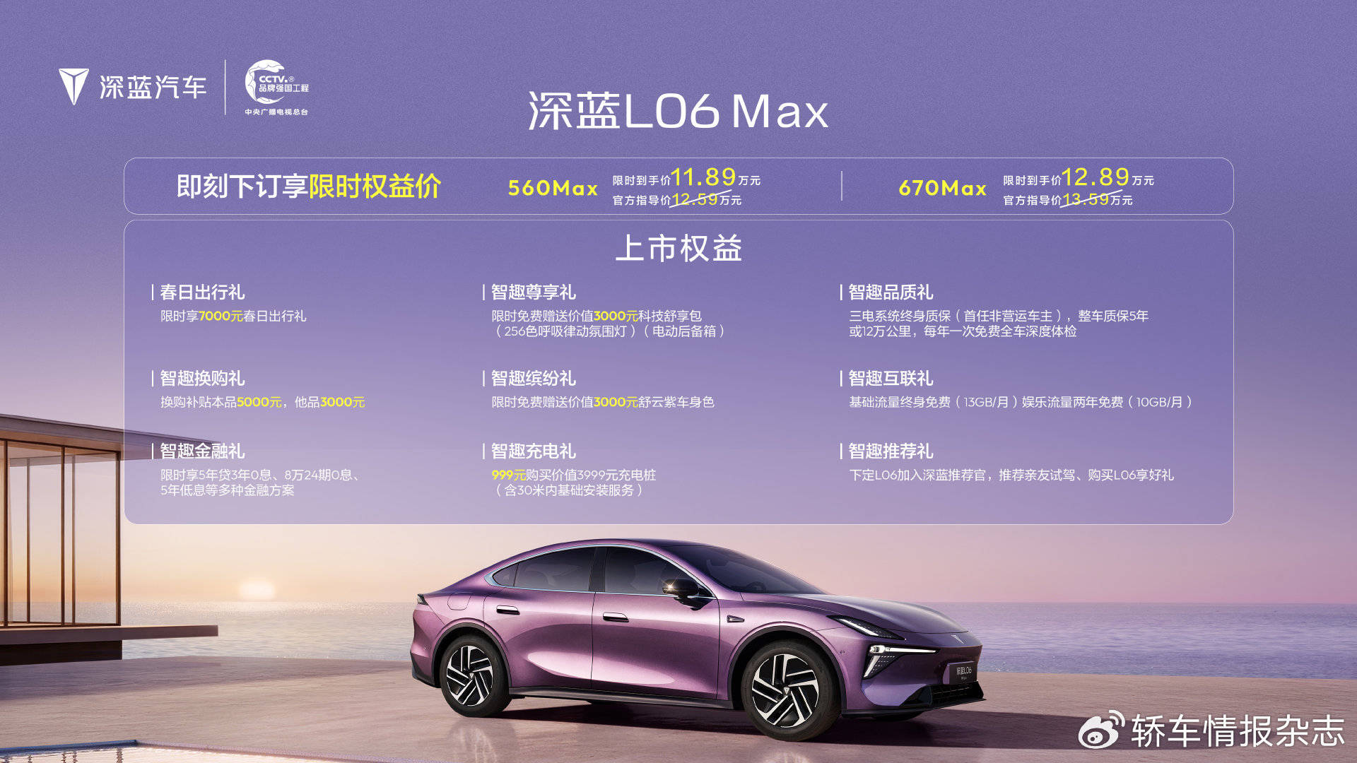 发布会上,深蓝L06 Max正式上市,推出560 Max和670 Max两款车型,官方指导价分别为12.59万元和13.59万元,限时到手价则降至11.89万元和12.89万元。这款定位长续航磁流变激光智能轿跑的新车,凭借“驾控之王、辅助驾驶老司机、座舱新贵、全系宁德、续航领先”五大越级配置,成为年轻人心中的理想座驾。其搭载的300万级豪车同款磁流变底盘,在中汽中心麋鹿测试中以85.6km/h的成绩超越百万级豪车,并斩获中央广播电视总台第六届《汽车风云盛典》“年度操控车型”称号。安全方面,全系标配宁德时代电芯+金钟罩电池,累计装车70万辆零自燃;续航上,CLTC工况最高达670km,支持3C超充,15分钟即可完成30%-80%充电。