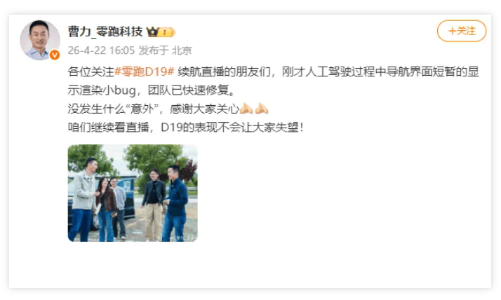 直播营销成为检验产品实力的新战场。雷军驾驶小米SU7完成1300公里不间断直播后,零跑迅速跟进推出D19千里续航挑战。这场从杭州到北京的直播却出现意外插曲:车辆行驶至高速路段时,中控屏AR导航界面突然黑屏,车道线、周边车辆等关键信息全部消失。尽管零跑高级副总裁曹力事后解释为“渲染小bug”,但直播中断引发的舆论关注,仍暴露出新技术应用的风险。