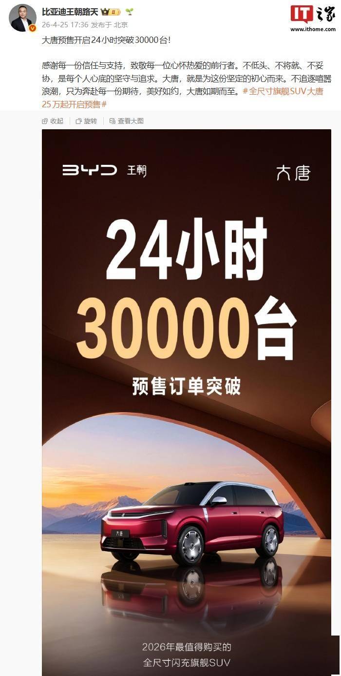 比亚迪王朝网近日迎来重磅消息,其首款D级旗舰SUV——大唐EV正式开启预售,并在短短24小时内斩获超30000台订单,市场热度持续攀升。作为王朝网的高端力作,这款新车以“全域豪华”为核心理念,集成了比亚迪最新技术成果,预计今年上半年正式上市。