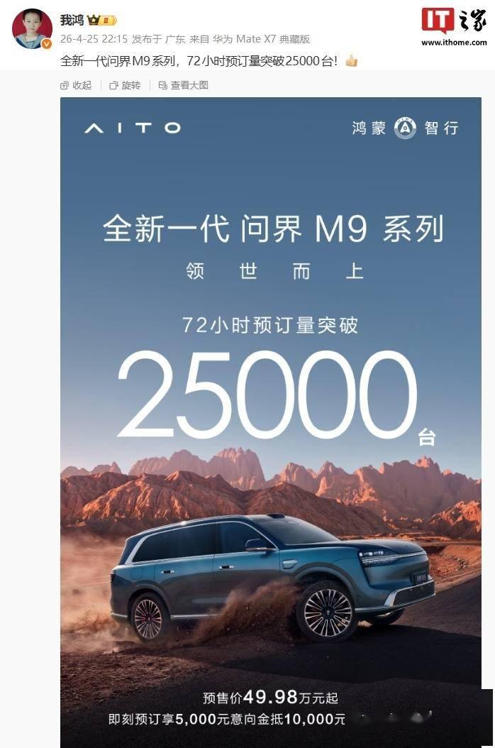 根据博主@我鸿的分享,全新一代问界M9系列汽车在发布后的72小时内,预订量已突破25000台。该车型的预售价从49.98万元起,显示出市场对这款新车的热烈反响。余承东曾强调,全新一代问界M9全车搭载了超过140项创新技术,这不仅仅是一次简单的升级,而是一次全面的重构。他表示,后续还将公布更多令人惊喜的细节。