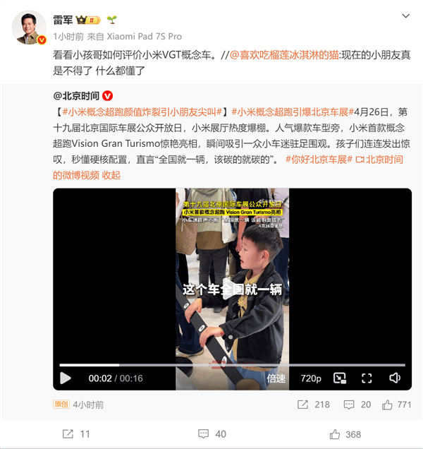 车展现场,小米首款概念超跑Vision Gran Turismo的亮相成为焦点。这款采用全碳纤维车身的未来座驾,凭借激进的设计语言和极致的性能参数,让“小孩哥”兴奋得连连尖叫。他指着展车向周围人介绍:“全国就这一辆,该用碳纤维的地方全用了!”这段童言童语的视频在网络上迅速传播,引发网友对小米设计实力的热议。