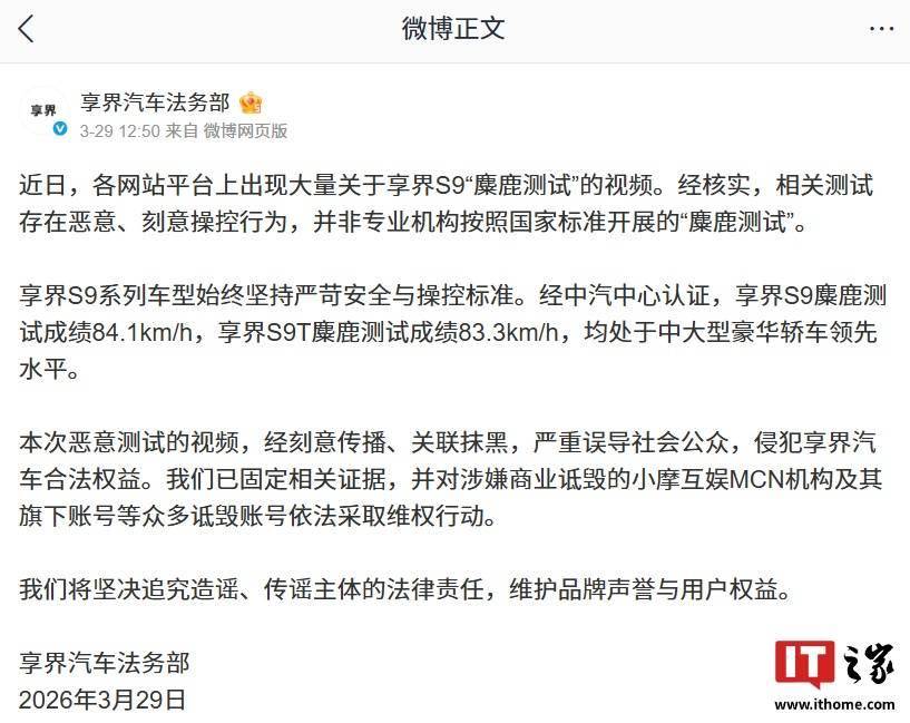此前,享界汽车法务部已发布声明,指出网络上流传的多个“麋鹿测试”视频存在严重问题。经核实,这些测试并非由专业机构按照国家标准进行,而是通过人为干预制造异常结果,误导公众对车辆性能的认知。