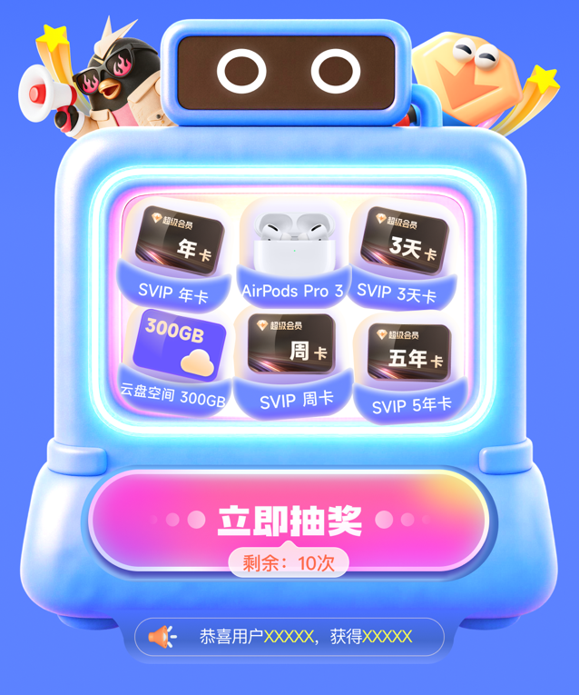 本次周年庆的另一大亮点是,用户参与抽奖即可中奖,奖品体系从即时体验到长期权益全面覆盖,包括:迅雷SVIP五年卡、AirPods Pro 3、迅雷SVIP年卡、月卡、周卡及短期体验卡、迅雷会员成长值、云盘空间等。
