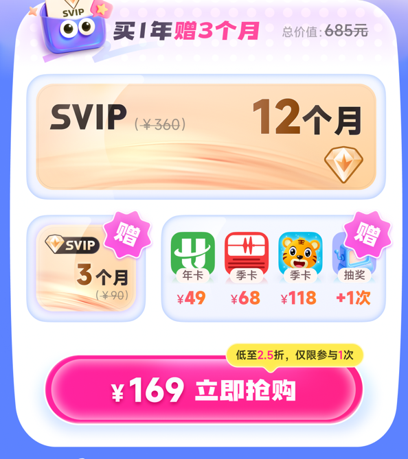 尝鲜款仅售169元,包含12个月SVIP,还赠送3个月SVIP以及联合会员(航旅纵横年卡、蜻蜓季卡、贝乐虎季卡)和1次抽奖机会。