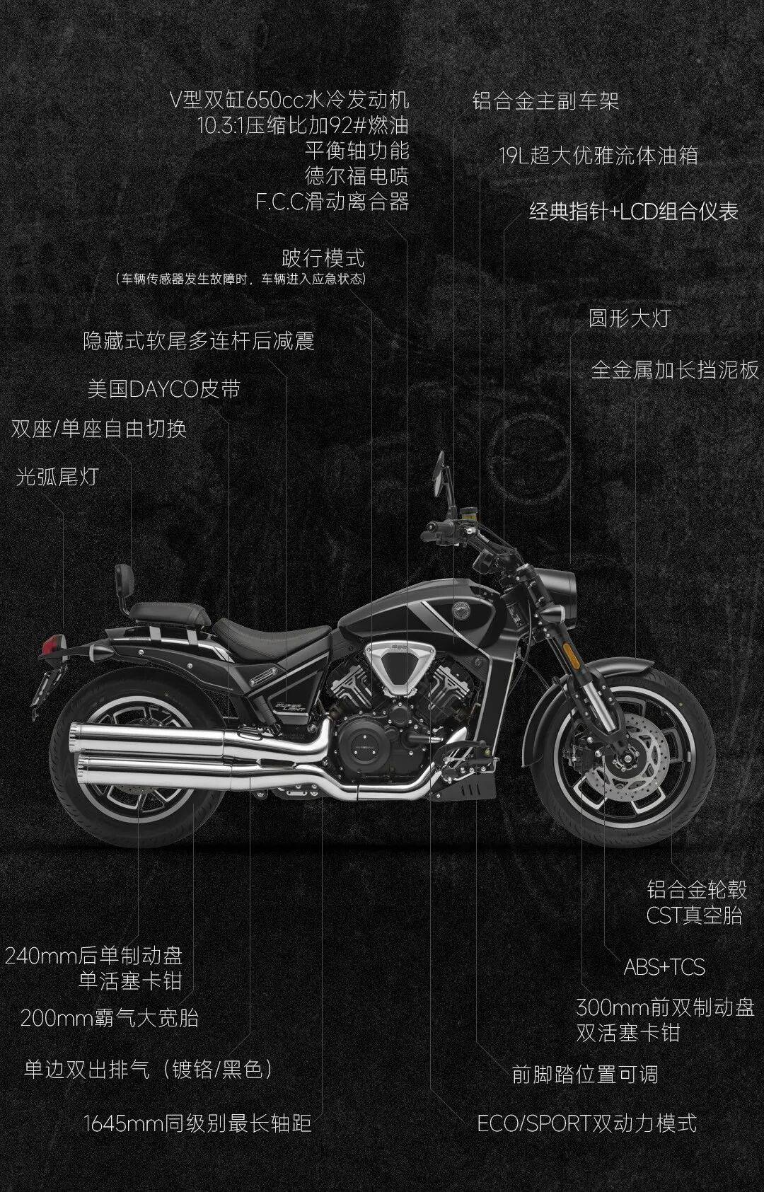 极光C652V搭载650cc V型80°双缸发动机,压缩比达10.3:1,日常使用92号汽油即可。其动力输出表现出色,在7500转时能输出最大功率41kW,6000转时爆发峰值扭矩62N·m,匹配福尔德电喷系统,并且内置平衡轴,有效提升了骑行的平稳性。在传动与减震方面,它采用主副铝合金车架,发动机与上下四根连接杆共同构成受力结构,增强了车身的坚固性。减震系统配备倒置前减和软尾中置多连杆隐藏后减,让车身呈现出修长且低矮的姿态,兼具美观与舒适性。