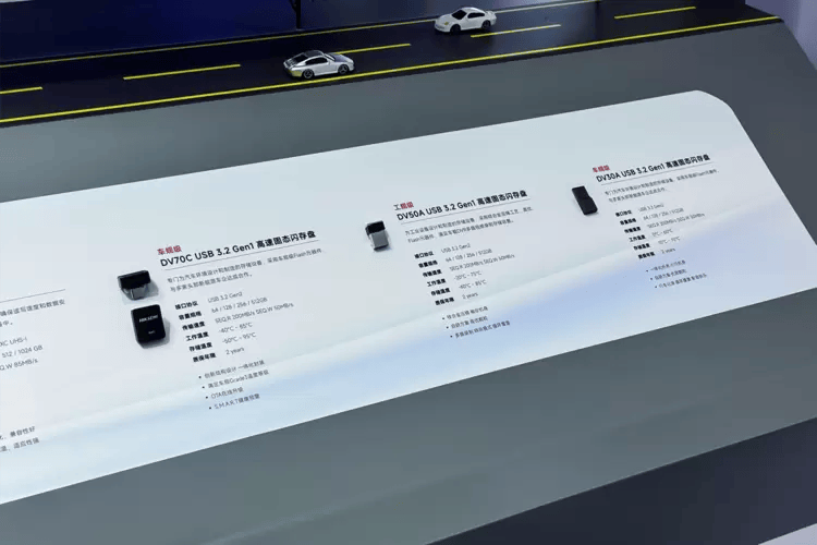 针对车企日益增长的定制化需求,海康存储在车展现场发布了三款全自研车载USB闪存盘新品。入门级DV30采用一体化设计,支持1-2路摄像头数据记录,擦写寿命达1000次PE;性能级DV50可适应-20℃至75℃环境,支持2-5路视频录制与OTA升级功能开发;旗舰级DV70则通过车规级元器件与HealthReport健康预警系统,实现-40℃至85℃极端环境下的数据安全存储。这三款产品形成完整的产品梯队,精准覆盖不同车型的存储需求。