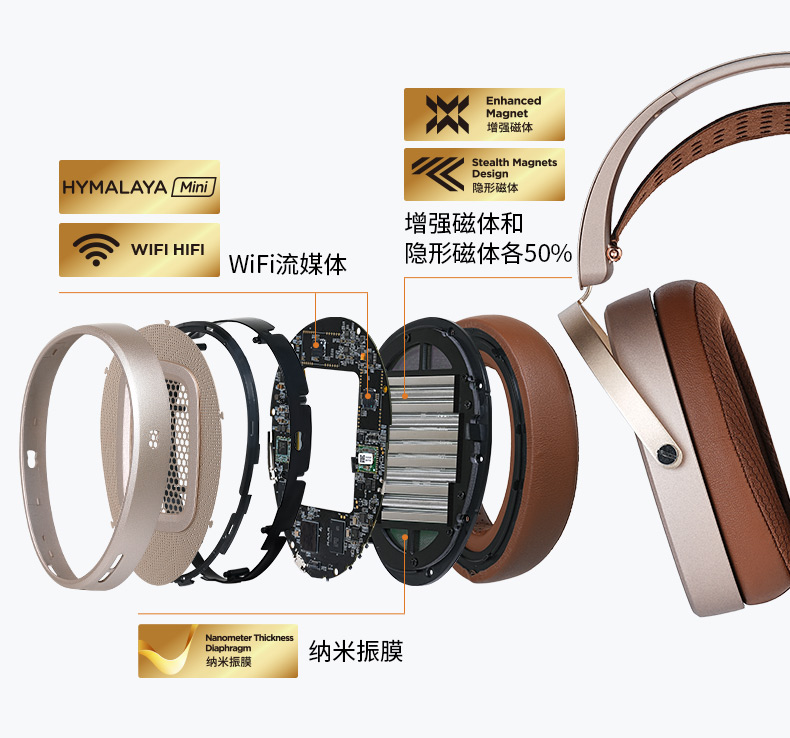 设计结构:声学架构延续同系列有线旗舰核心配置,纳米级振膜、增强磁体与混合磁体复合磁力系统,内置喜马拉雅R-2R Mini版定制音频DAC芯片。采用平板振膜搭配隐形磁体特殊结构设计,优化磁体缝隙空气湍流与声波反射问题,规避传统磁体结构带来的音质损耗,保障声波无损传导。