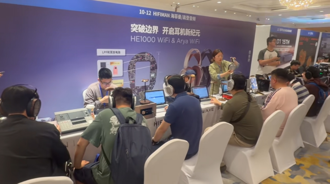预算与使用场景:产品定位高阶影音需求群体,面向资深烧友与专业音乐爱好者,适配古典、人声、交响等多元曲风,主打室内沉浸式高端聆听场景。近日举办的第八届成都国际耳机展现场HIFIMAN展台多名资深烧友与音频爱好者现场体验HE1000 WIFI。