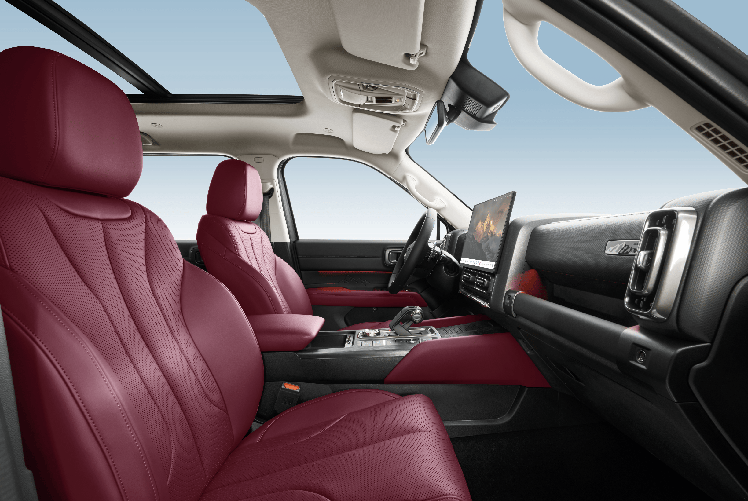 内饰空间在保持硬派风格的同时,通过材质升级和科技配置注入豪华基因。15.6英寸2.5K中控屏支持93% P3广色域显示,可切换5种画面模式。搭载的Coffee OS3智能系统集成手机互联、四音区语音交互及Coffee GPT智能助手,后者可提供百科查询、路线规划等越野场景服务。熔岩红内饰配色与大面积软质包裹打破传统硬派车型的沉闷感,方向盘加粗设计提升握持舒适度。