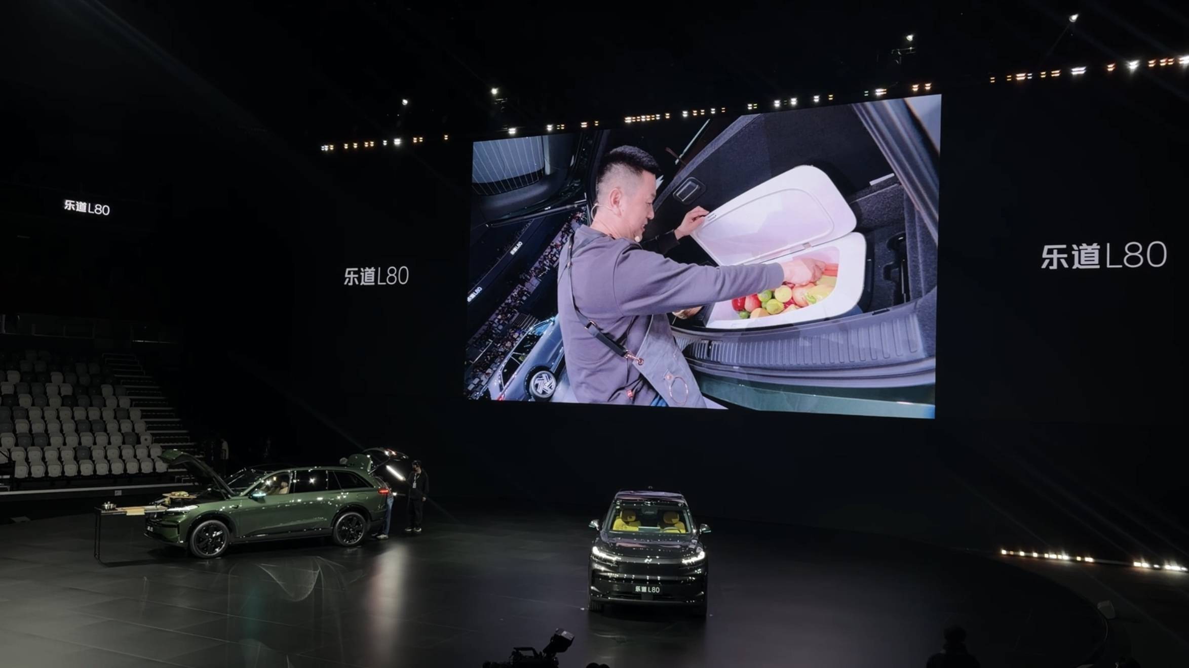 空间设计方面,乐道L80突破传统SUV布局限制。前备厢容积达240L,后备厢基础容积1200L,二排座椅完全放倒后可拓展至2600L,形成纵深2.2米的纯平空间。发布会现场演示中,车辆通过双下沉储物系统实现分层收纳,外侧106L沉坑与内侧63L沉坑可分别存放运动装备与日常物品。更引人注目的是其多场景适配能力,蔚来高管现场展示后备厢铺床休息、遛狗等生活化场景,凸显空间灵活性。