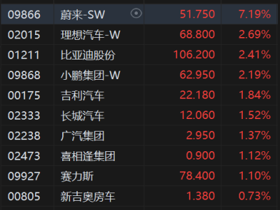 港股异动丨汽车股拉升 蔚来大涨超8%领衔 比亚迪股份绩后冲高近5%