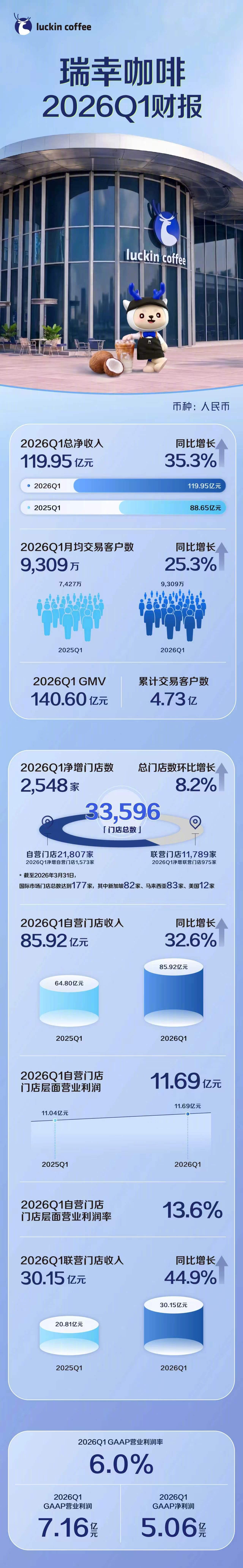 瑞幸咖啡近日公布了2026年第一季度财务报告,数据显示公司在全球市场的扩张步伐持续加快,整体业绩实现稳健增长。报告期内,瑞幸总净收入达到119.95亿元人民币,较去年同期增长35.3%,门店总数突破3.3万家,月均交易客户数攀升至9309万,同比增长25.3%,进一步巩固了其市场领先地位。