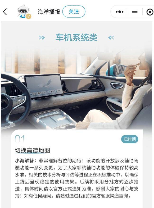 官方透露,地图应用切换涉及辅助驾驶系统的底层架构调整,为确保领航辅助功能的稳定性,技术团队正在进行多维度评估与测试。该功能将采取分批次推送策略,具体上线时间需以官方最终通知为准。值得注意的是,此次升级标志着比亚迪智驾生态的重要转变——天神之眼C智驾车型将逐步从百度地图定制版过渡至高德地图定制版。