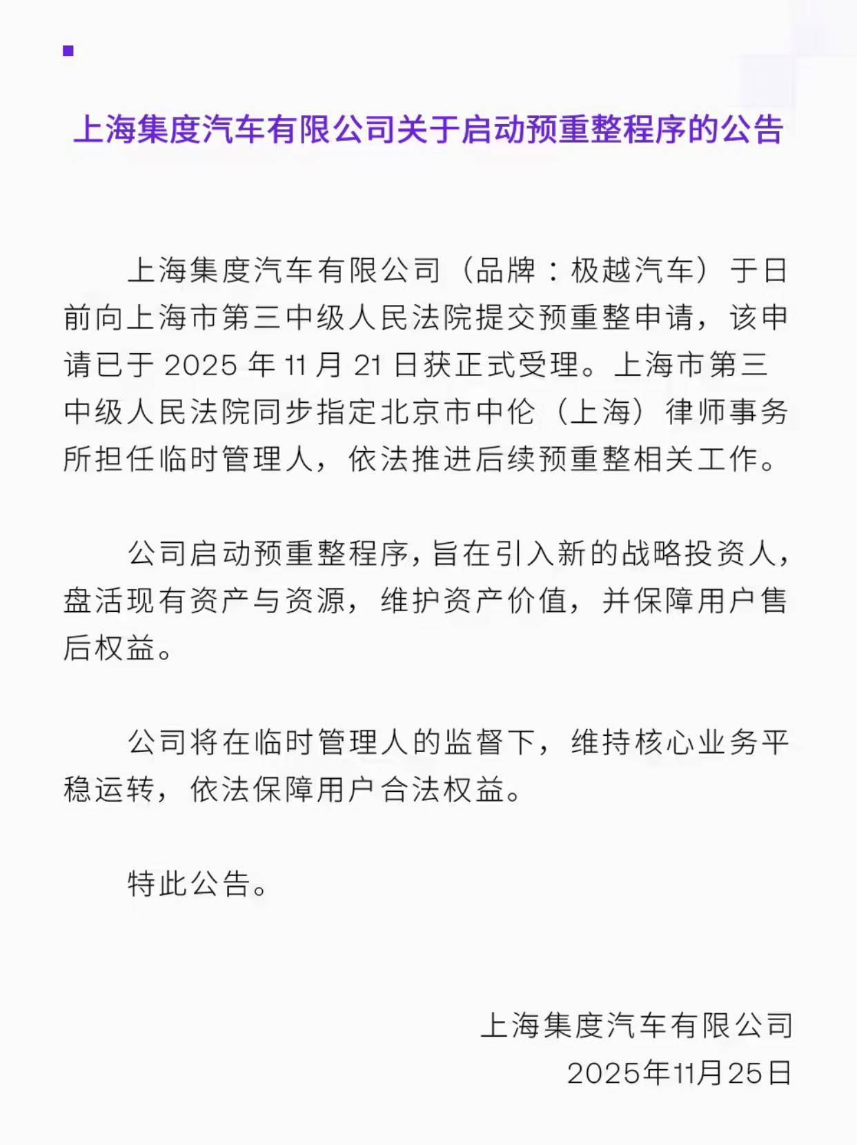 公开信息显示,极越汽车品牌运营方上海集度汽车有限公司于2025年11月21日获得上海市第三中级人民法院受理的预重整申请。法院同步指定北京市中伦(上海)律师事务所担任临时管理人,负责监督企业核心业务运转及推进预重整相关工作。根据企业发布的公告,预重整的核心目标是通过引入战略投资人,在维护资产价值的同时保障用户售后权益。