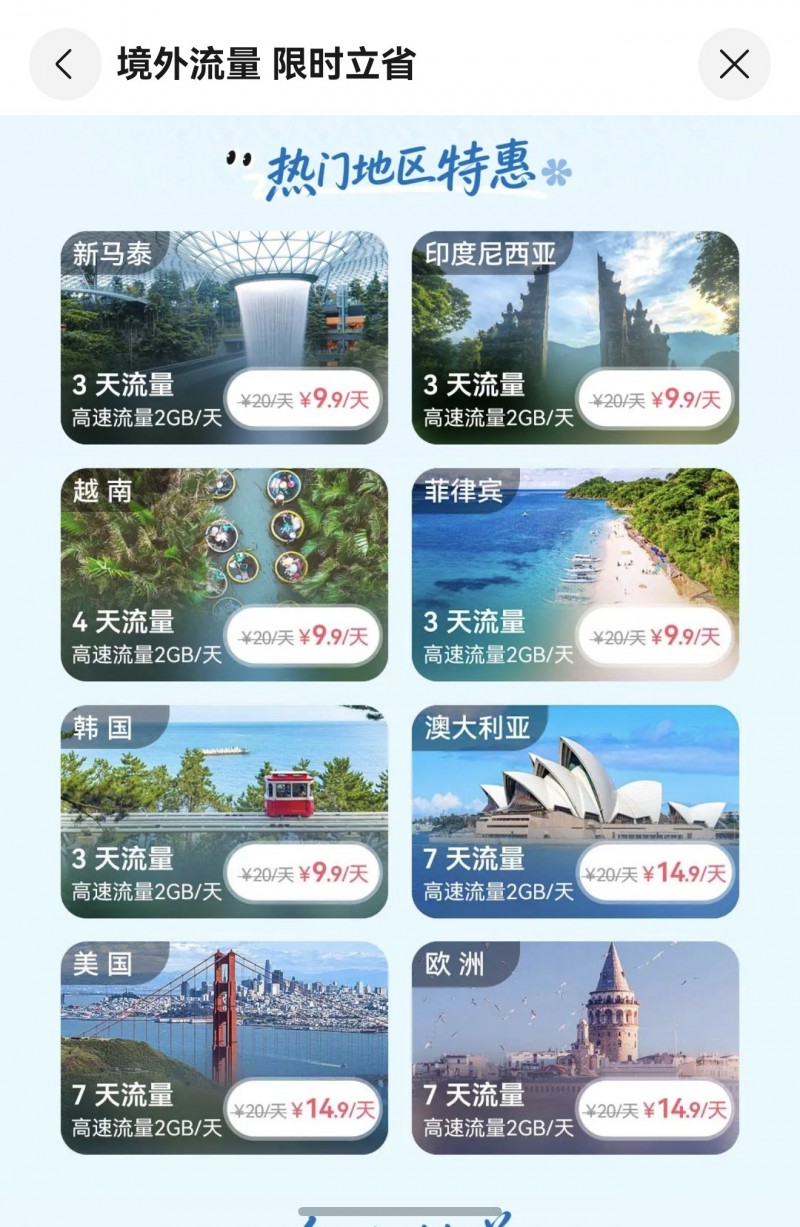 第二重:热门地区精选包天套餐,9.9元起/天锁定短期行程。 对于行程天数明确、仅停留固定国家的用户,可选择天际通特惠包天套餐。短途热门地区(新马泰、韩国、印尼、菲律宾等地)仅9.9元/天,适合三四日游的短途打卡;长途热门地区(欧美多国、澳大利亚)可享受14.9元/天的实惠包天价。一次性购买固定天数的套餐,实现总花费精准控制。