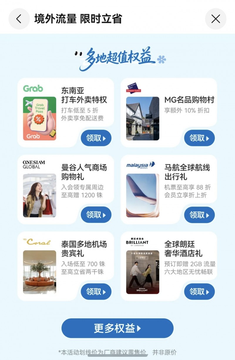 第三重:多国超值权益,吃喝玩乐购叠加,机票出行、打车外卖、购物血拼均享专属福利。 除了上网流量,华为天际通还联合多家本地品牌及出行平台,推出联名消费大礼包。出行时选乘马航,全球航线机票最高可享88折,会员还可享受折上折。抵达东南亚各国后,无论从酒店前往景点,还是宅在酒店点特色餐食,用Grab打车费用低至五折,外卖还能免配送费,一键下单即可省钱。在曼谷暹罗百丽宫等商圈,申领 ONESIAM 全球游客卡即可获赠限定大象钥匙扣,甚至佩戴华为穿戴设备步数满 2000 步也能兑换专属礼品卡,让每一步探索都有惊喜。奔赴欧洲血拼购物,可先乘坐免费班车到达欧洲MG名品购物村。在奢品大牌本就低至3折的基础上,华为天际通用户再叠加10%专属折扣;消费满500欧元,还能获赠美泉宫门票。如果你恰好在巴黎,还能领取免费冰淇淋,让购物之旅更惬意实惠。