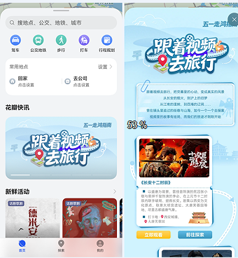 4月13日-5月10日期间,花瓣地图联合华为音乐、华为视频、华为阅读三大应用,推出 “跟着音乐/视频/书籍去旅行”主题活动。以一首歌、一部剧、一本书为向导,一键跳转导航,让影音书香带你真正走进一座城市。