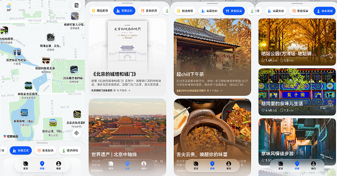 花瓣地图还有一个非常实用的“周边探索”功能,同样适合五一出行使用。打开花瓣地图,点击首页底部的“探索”按钮,就能快速找到周边的美食、景点、购物、休闲等各类好去处。这里覆盖了全国各个城市,既有杭州、大理、南京、重庆、成都等热门目的地,精美地点指南按主题划分:精选推荐、宝藏去处、徒步路线、美食地图。近期还增加了江西婺源、绍兴安昌、湘西土家族自治州、湖州南浔、临沧鲁史等特色古镇指南,还有景德镇陶瓷艺术、荆州三国文化等地古镇,为喜欢古风、慢生活的用户专属打造。攻略与导航一体化,不用再在笔记APP、评分软件和地图之间来回切换。无论你是想找一家地道小馆,还是发现一个冷门景点,点一下“探索”就能直接导航过去。
