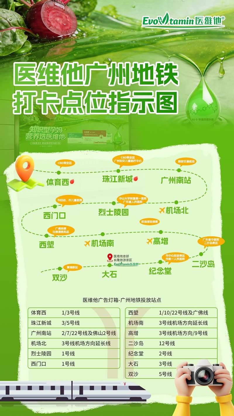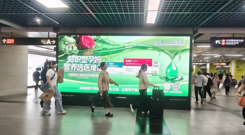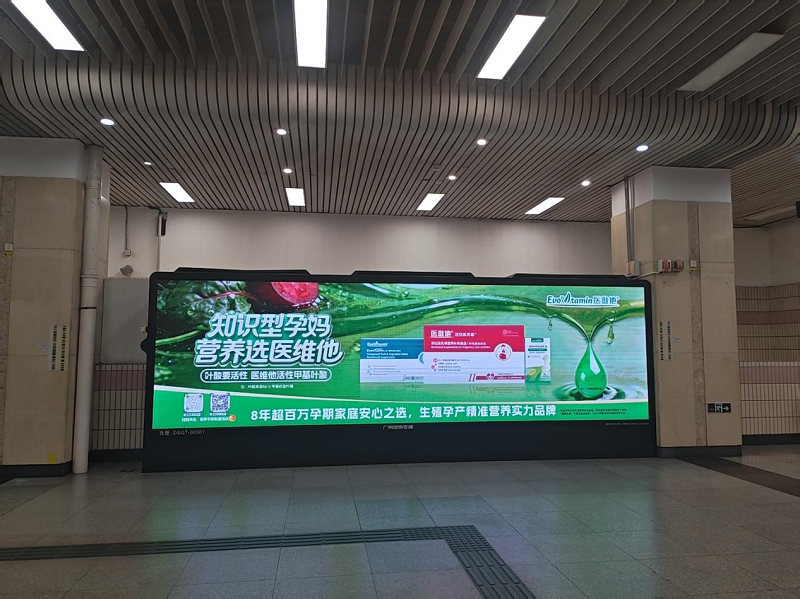 此次医维他广州地铁广告投放,精准覆盖了广州地铁多条核心线路的关键站点,形成了一张全方位、高触达的传播网络。从 CBD 商务中心珠江新城、体育西,到广州南站、机场北 / 南、高增等交通枢纽;从中山大学附属第一医院、广东省人民医院、广州市妇女儿童医疗中心、市妇幼、市儿童医院等重点医疗周边站点,到烈士陵园、纪念堂、二沙岛、大石、双沙等城市核心区域,医维他的品牌大屏以醒目的视觉设计,将 “叶酸要活性,医维他活性甲基叶酸” 的专业信息,传递给每一位通勤市民。尤其是在广州日均超千万人次的地铁客流中,品牌信息实现了高频次、强曝光的触达,让科学孕产营养知识,渗透到城市生活的每一个角落。
