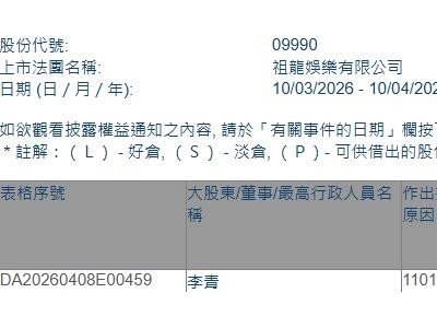 祖龙娱乐(09990.HK)获主席兼执行董事李青增持12.1万股