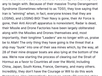 特朗普:已经开始清理霍尔木兹海峡,以造福世界各国