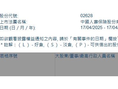 中国人寿(02628.HK)获平安人寿增持1261.5万股