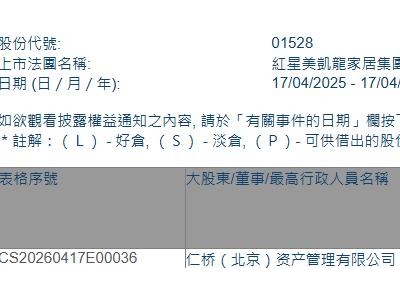 红星美凯龙(01528.HK)获仁桥(北京)资产管理有限公司增持416.68万股