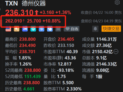 美股异动丨业绩亮眼,德州仪器盘前大涨近11%,开盘势创新高