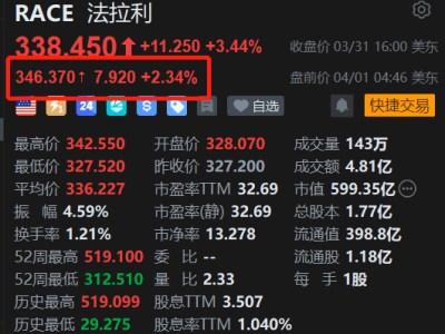美股异动丨法拉利盘前续涨2.3% 杰富瑞上调其评级至“买入”升目标价至400美元