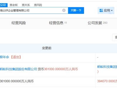 蚂蚁集团旗下云抒企业管理公司增资至39.4亿 增幅约9%